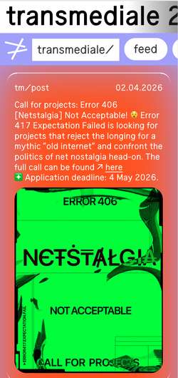transmediale βΌ annual festival bringing together international artists, researchers, activists, and thinkers with the goal of developing new outlooks on our technological era through the entanglement of different genres and curatorial approaches